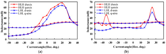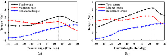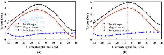 Figure 14. It can be observed that the maximum torques all occur at a negative current angle of −10 and −5 electrical degrees for the HLH and LHL structures, respectively. Furthermore, the reluctance torque is positive in the selected current angle range, which increases the total torque capability.