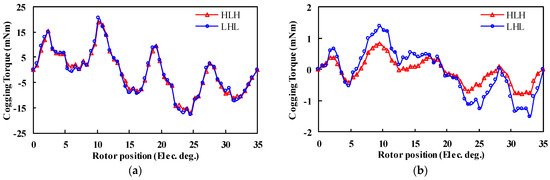 Figure 13. It can be seen that the ripple patterns of the cogging torque of the two cases under the “