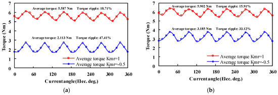 Figure 15. It can be observed that the maximum torques all occur at a positive current angle of 15 and 25 elec. deg. in the two cases, respectively. Due to the low MS of the LCF PMs, the magnet torque decreases significantly compared with that at the flux-enhanced state.