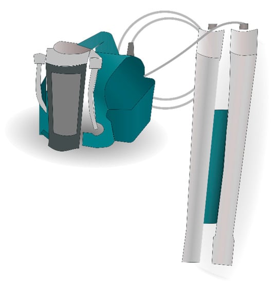 The portable RO system that could be installed in the EV could for example be purchased from the manufacturer Rainman [36], and a sketch of such a small potable RO system is shown in Figure 2. The RO desalination system includes two RO membranes, each with a length of about 1 m, connected to a motor, a pump, and a prefilter. The system includes a lift pump to pump in saline water to the desalination system, through an intake hose that is placed in the saline water. As the pressure is increased on the RO system, it will result in separating freshwater and brine. This Rainman portable desalination system can produce up to around 140 L per hour, according to the manual [36], which in total is 3360 L per day during full production rate.