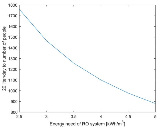 This suggests that for one day, the van can drive 10 km and produce up to 29,333 L. If one person would use 20 L of water for basic water access [40], 1466 people could benefit from the system. The efficiency of the RO system affects the amount of water produced per day from the vehicle, and assuming, that the energy needed of the RO system, ERO, varies from 2.5 kWh/m3 up to 5 kWh/m3, the amount of people that could benefit from one vehicle (assuming a daily need of 20 L) is shown in Figure 3.