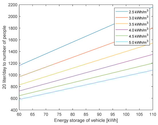 Moreover, the amount of energy stored in the battery of the EV affects how many people that could benefit from the system, as shown in Figure 4, for a battery storage of 60 kWh up to 110 kWh for one vehicle and shown for different energy needs of the RO system (from 2.5 to 5 kWh/m3). This is an example where the desalination system inside the vehicle is not limited in how much it can produce each day due to its size.