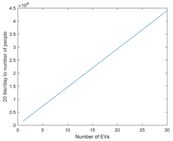Assuming that several vehicles are used, with the input values presented in Equation (2), the amount of people that could benefit from the system and receive about 20 L increases, is shown in Figure 5. For around 30 EVs, the system could provide clean water (here 20 L per person and day) to above 40,000 people daily.