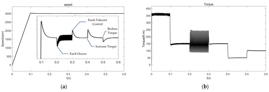 Figure 8 shows the whole process from start-up to fault, and finally to fault-tolerant operation under improved MRAS speed sensorless control. The fault-tolerant control strategy ensures the stability of the whole system. Even if the load is increased or reduced, the system can rapidly adapt to the difference. No matter in which period, the proposed speed estimation method can accurately calculate the speed and angle of the motor, which expands the application scenarios of speed sensorless control.