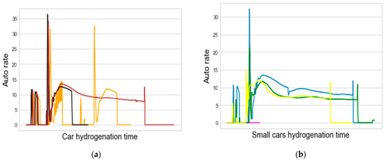 (a) The relationship between the hydrogenation rate and hydrogen time for small and medium-sized automobiles. (b) The relationship between the hydrogenation rate and hydrogenation time for large automobiles.