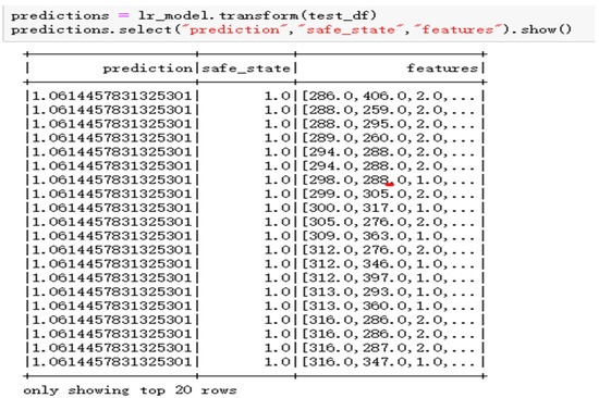 In this study, pyspark MLlib was used to analyze the algorithm, and the “safe state” was set as the prediction target; the rest of the data were set as the characteristic values [17,18]. The data were divided into a training set and test set for a numerical simulation. Finally, according to the stochastic gradient descent algorithm provided above, a minimum point convergence can be obtained, to find the optimal function x. In the algorithm, the data source of the input layer is related to the entire hydrogenation process. The model includes tanked hydrogen trucks, two hydrogen compressors, high-pressure compressors, and medium-pressure compressors, as well as a final gas dispenser and gas filling trucks. All the data are linked by the same time stamp, and there are temperature and pressure sensors in all the devices. The filling flow also involves the filling port. Monitoring the filling flow rate can most intuitively indicate whether the current external hydrogenation environment is safe. Using the pyspark MLlib algorithm for data analysis, the predicted safety factor and related feature label data can be obtained [19].
