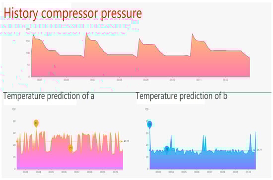 At the same time, the outlet temperatures of compressors A and B were transmitted from the back end to the front end, and the direction of data flow was displayed using the Echart function. When there is a fluctuation, it means that the filling machine is working for the vehicle and needs to be pressurized before filling. The following high-pressure temperature prediction and medium-pressure temperature prediction are the inlet temperatures of the high-pressure hydrogen storage tank and the medium-pressure hydrogen storage tank connected to compressors A and B, respectively, which are important characteristic indicators of system safety. Therefore, the calculation method, high-pressure temperature and medium-pressure temperature are visually monitored. As shown in Figure 5, we extracted the predicted feature data and filtered out the predicted equipment temperature of the compressor for visualization. The horizontal axis is the start time, and its unit is seconds.