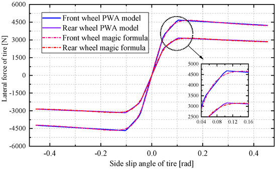 The lateral force of the tire has a nonlinear relationship with the tire sideslip angle that may cause a huge amount of computation when solving the optimization problem, for which it’s difficult to calculate directly in the original nonlinear MPC algorithm. To approach the real driving scenario, in this paper, a piecewise linear function is applied to describe the characteristic of tires, then a hybrid model can be constructed by a PWA of magic tire model shown below in (2), where is the lateral force of the right and left tire, , , , are the paraments affected by the tire characteristics, , , are the line slope, , are the line intercept, , , are the segregating points, and the subscript represents the front and rear wheels.