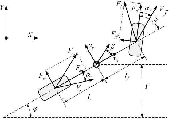 By assuming the longitudinal velocity and lateral velocity of the four-wheel are the same as one of the center of mass, the front and rear sideslip angle and can be calculated as follows, where the is the front wheel steering angle.