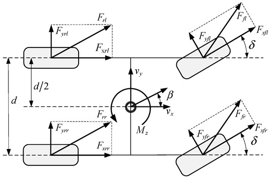 In Equation (9), the yaw moment is calculated from the longitudinal forces of four independent wheels. By controlling the four in-wheel-motor, the yaw moment can be exerted on the vehicle by applying differential torque. , , , , respectively, represent the longitudinal forces as shown in Figure 3.