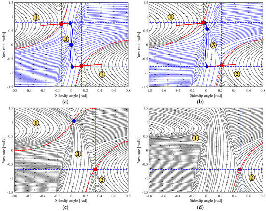 The front-wheel steering angle has a great influence on the change of - phase portrait. Figure 4 and Figure 5 show the phase portrait based on Equation (8) of the sideslip angle and yaw rate with different steering angles: 0 rad, 0.1 rad, 0.25 rad, 0.35 rad. The fixed points marked as blue or red can be directly found in Figure 4, respectively, the blue point represents the stable equilibrium point that the domain around which is convergent, and the red points are saddle points showing bifurcation behavior, which can be regarded as the boundary points between stable region ③ and unstable region ① and ② depicted in the streamline of a different color. For searching the motion law of the fixed points, we set the derivatives of the sideslip angle and yaw rate to zero and decouple the expression with and , then we can obtain (10):