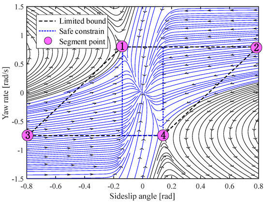 When setting the steering angle from −0.35 to 0.35 rad, the trace of different fixed points at various steering angles can be described as the blue and red solid lines shown in Figure 4a,b, respectively, represent the trace of stable point and saddle point. The diamond blue points are terminal positions of stable point motion. In Figure 4a–d, the fixed point moves along the calculated trace with increasing. When the steering angle reaches up to 0.35rad, the stable point has disappeared at the terminal position, after that there is no stable region in the whole area. By analyzing the regular pattern of the phase portrait, the boundary and safe constraints can be presented as shown in Figure 5. The segment points are obtained by the saddle points position, all the coordinates are: (−0.1,0.77), (0.8,0.77), (−0.8,−0.74), (0.2,−0.74), by which a working area to ensure practical stability for the system is obtained.