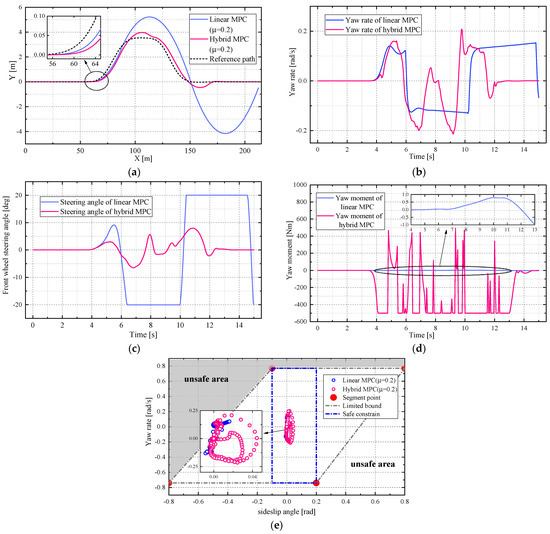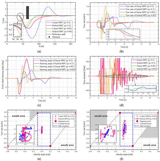 In the scenario of , the linear MPC controller causes a high amplitude, on the contrary, the hMPC tracks the path smoothly. In the scenario of , as shown in enlargement of Figure 10b, the linear MPC controller responds more slowly than hMPC when the avoidance signal triggers. The additional vehicle parameters comparison is presented in Figure 10c–e. In Figure 10c, the results show that the hMPC controller can immediately respond to the avoidance signal compared to linear MPC. In the scenario of , the yaw rate using hMPC becomes stable at the latter part of the lane while using linear MPC still fluctuates, the same conclusion is reflected in Figure 10d. Figure 10e demonstrates that the additional yaw moment control signal calculated by hMPC is widely utilized in the process of path tracking, but when obtained by the linear MPC is small and cannot improve the control ability.
