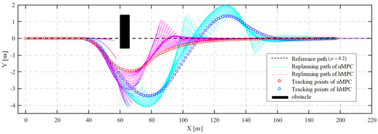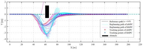 The optimization problem expressed in Equation (26) is similar to the nMPC problem, where represents the prediction sequence tracking error between current lateral displacement and the replanning path value obtained by (19), is the prediction sequence of inputs’ increment between and sample. Under the constraints analyzed in Section 2, the optimal value of the MIQP problem shown in (26) can be calculated by the hMPC algorithm at each receding horizon.