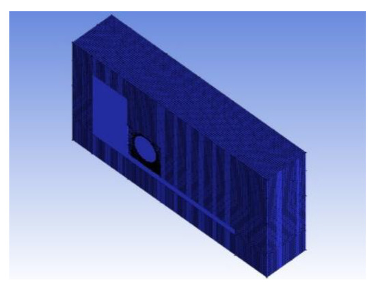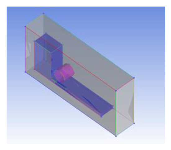On the basis of the analysis of fuel cell vehicles and vehicle—board hydrogen supply system structure, the physical model is simplified, the hydrogen storage bottle, cab and chassis structure are retained, and the pipes and valves are omitted. The cab and chassis are reduced to rectangular, the hydrogen cylinder is reduced to cylindrical, and the 10 m × 4 m × 5 m rectangular computing space is determined. The cab is 1.84 m × 2.55 m × 3.086 m rectangular, the chassis is 5.54 m × 2.55 m and the hydrogen storage bottle is a rectangle with a diameter of 1.11 m and a height of 2.162 m. The hydrogen storage bottle is 0.9 m, the hydrogen storage tank above the chassis is 0.87 m away from the rear wall of the cab, and the body is 1 m high from the ground. To reduce the computational time, half of the simplified model is taken as the physical model for the solution calculation, as is shown in Figure 1.