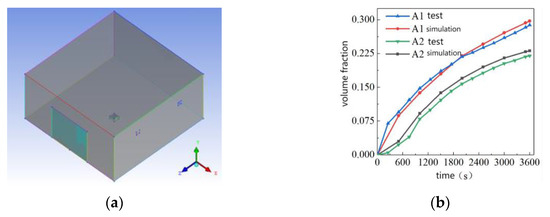The hydrogen leakage and diffusion test in space made by Pitts et al. [27] is simulated and verified to verify the rationality and accuracy of the simulation method used in this paper to simulate the concentration distribution in the process of hydrogen leakage and diffusion in space, tested at 6.1 m × 6.1 m × 3.05 m. The physical model established according to the test scenario is shown in Figure 4a. Hydrogen leaks upward into the space through a square leakage port with a side length of 0.305 m at the height of 0.15 m in the lower part of the space.