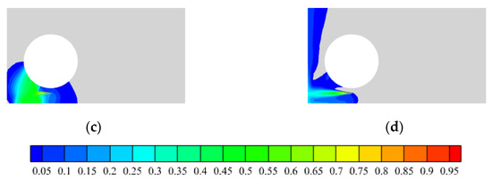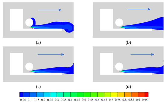 Distribution diagram of hydrogen concentration in open space vent II. These are listed as: (a) t = 0.5 s; (b) t = 1.5 s; (c) t = 9.5 s; (d) t = 11 s.