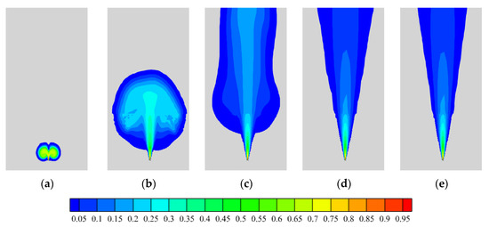 Distribution Chart of Hydrogen Concentration at Leakage Site III in open space. These are listed as: (a) t = 0.25 s; (b) t = 0.5 s; (c) t = 0.75 s; (d) t = 1.5 s; (e) t = 15 s.
