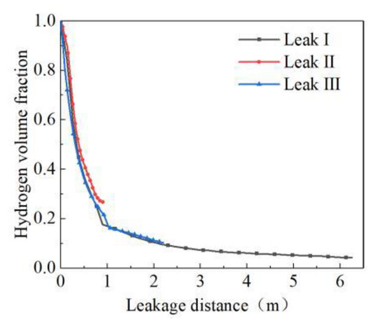 The change of hydrogen concentration on the three outlet leakage axes is compared as is shown in Figure 8. It can be seen that when the leakage rate, leakage diameter and other parameters are the same, the hydrogen concentration change curve on the leakage axis is basically the same, and the leakage port and hydrogen leakage axis are 6.255 m, 0.9 m and 2.2 m. It can be concluded that the safe distance of hydrogen diffusion under this simulation condition is about 6.25 m long.