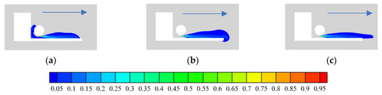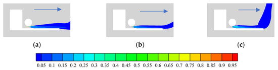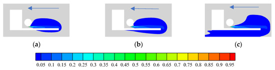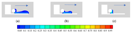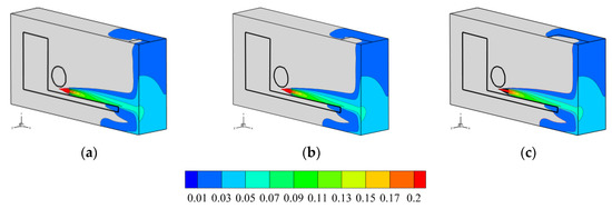 Distribution diagram of hydrogen concentration at different leakage rates at t = 0.75 s. These are listed as: (a) Q = 20 g/s; (b) Q = 10 g/s; (c) Q = 5 g/s.