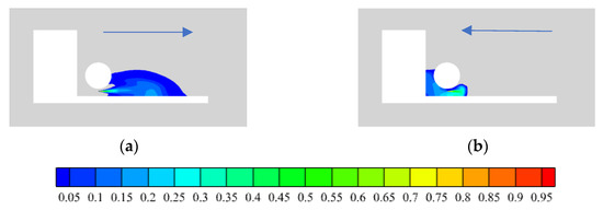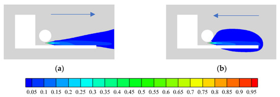 Distribution of hydrogen concentration in different wind directions at t = 0.5 s. These are listed as: (a) following wind; (b) against the wind.