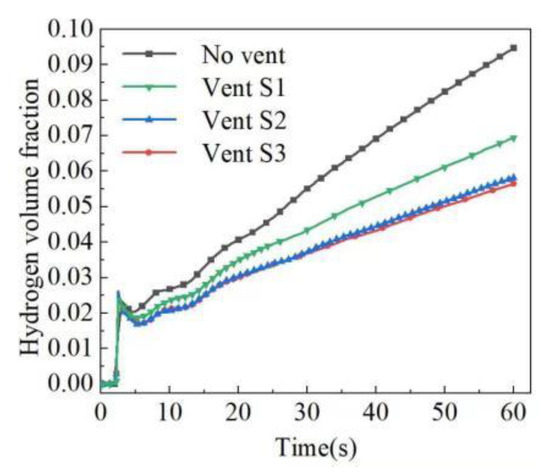 Change of hydrogen concentration at the monitoring points at different vent locations.