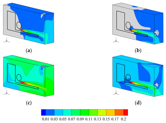 The concentration distribution of hydrogen diffusion in closed space at different vent locations is shown in Figure 21. It can be seen that at the beginning of the hydrogen leakage to the rear of the vehicle, the hydrogen gas at the top vent S1 of the environment has diffused along the upper wall of the space to the front of the space, while the hydrogen at the rear vent S4 of the environment has just diffused to the middle of the space. At the end of the simulation, the concentration and distribution of hydrogen in space in the top vent environment is larger, and the difference is still mainly concentrated in the upper half of the space. The reason is that in the case of hydrogen leakage to the rear of space, compared with the top vent, opening a vent at the back of space can make more hydrogen diffuse directly from the vent to the external environment. The diffusion process and concentration distribution range of hydrogen in space are significantly affected.