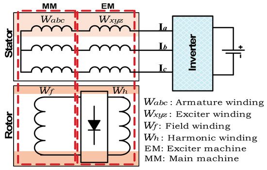- Bukhari, S.S.H.; Ahmad, H.; Chachar, F.A.; Ro, J.-S. Brushless Field-Excitation Method for Wound-Rotor Synchronous Machines. Int. Trans. Electr. Energy Syst. 2021, 31, e12961. [Google Scholar] [CrossRef]