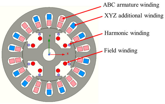 For the finite element analysis (FEA), a conventional structure of an 18-slot four-pole machine is selected, as shown in Figure 2, and the parameters are shown in Table 1. The armature winding of the machine has 300 turns, whereas the Wxyz has 150 turns. For the symmetric number of conductors, the turns for Wxyz winding are calculated by keeping the same current density as the armature winding. It turns out that for an 18-slot machine, armature winding can be distributed by considering a room for a 12-slot XYZ winding. It means that the Wxyz can be distributed in only 12 slots with full armature winding turns in the remaining six slots for optimal distribution of both windings. However, the Wxyz can be distributed in four different patterns by a combination of three-phase sequence slot pitch.