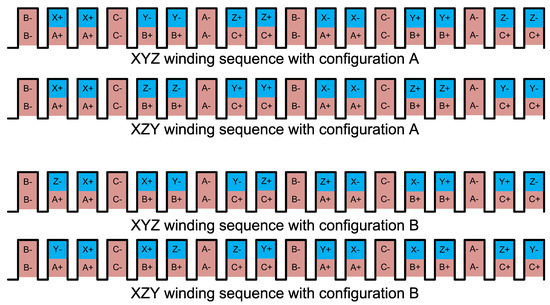 The winding Wxyz is distributed and arranged in four different patterns for a comparison of the best arrangement for high power transfer possibility. With respect to a phase sequence of ACB for armature winding, the winding Wxyz arrangement patterns are type A with XYZ sequence, type A with XZY sequence, type B with XYZ sequence, and type B with XZY sequence, as shown in Figure 3.
