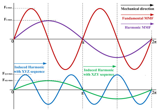 Illustration of the fundamental MMF, harmonic MMF, and the induced harmonics in the machine.
