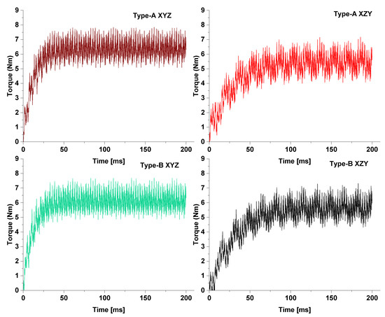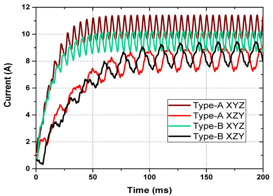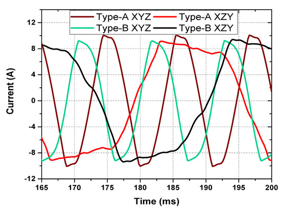 As the field current in the type-A XYZ pattern is highest compared to all of the other currents, the torque of the machine with this combination must also be highest among all of the patterns. The electromagnetic torque of the machine is compared in Figure 7. The highest torque generated in the type-A XYZ winding sequence is due to the high field current. Since the two-pole MMF component is generated in the air gap with the XZY winding, the interception of rotor harmonic winding induces a harmonic voltage. The frequency of this voltage and thus the current in the harmonic winding matches the two-pole harmonic component in the air gap. However, when the sequence is reversed, i.e., from XZY to XYZ, the relative speed of harmonic winding interception increases to three times. Therefore, the induced voltage and current frequency is three times of the original frequency. Due to the fact that the induced voltage depends on the rotating speed of the flux in the air gap, the voltage generated in the rotor excitation is higher in the XYZ case. Eventually, it will increase the field current and torque of the machine.