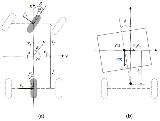where m—the mass of the vehicle; —the spring-loaded mass; h—the height difference between the centre of mass of the vehicle and the centre of sway; —the lateral forces of the front and rear wheels; —lateral camber angle; —the lateral deflection stiffness of the front and rear wheels.