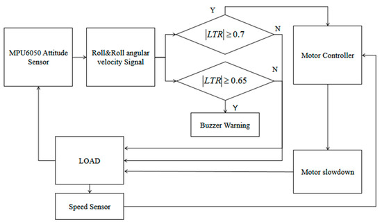 According to Equation (9), the vehicle’s rollover evaluation index LTR needs real-time rollover angle and rollover angle speed; therefore, the MPU6050 sensor is used to obtain the input data for the control algorithm, the X-axis angular speed in the original data it measures is the rollover angle speed, and the cross-roll angle (roll) obtained through attitude solution is the rollover angle. The two data are transmitted to the microcontroller synchronously for the calculation of the LTR dynamic value. When the absolute value of the dynamic transverse load transfer rate reaches 0.65, close to the limit threshold, the buzzer generates an alarm sound signal, and when the limit threshold of 0.7 is reached, a drive motor speed control signal is sent out to control the motor controller to reduce the motor speed, so that the car can return to a safe driving state smoothly and achieve the purpose of avoiding rollover [23]. The speed sensor acquires the motor speed in real time and transmits the acquired data to the microcontroller as closed-loop feedback for the motor control algorithm. The block diagram is shown in Figure 3.
