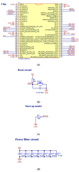 The development board designed in this paper used the STM32F103RET6 chip from ST. This chip contains up to 64 KB of embedded SRAM and 512 KB of FLASH, 8 timers, as well as SPI, IIC, USB, CAN, SDIO, FSMC interfaces, a total of 64 pins, and can output 5 V and 3.3 V. The chip MCU requires a minimum circuit system design, which is the module that guarantees the proper operation of the microcontroller. Development boards for microcontrollers are generally based on a minimal system with peripheral modules to achieve various functions. The minimum circuit system of the main control chip MCU includes the power supply module (power inlet, power filter, voltage conversion, over-current protection), reset circuit, start-up mode circuit, and crystal oscillator circuit [24].