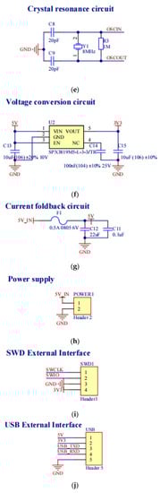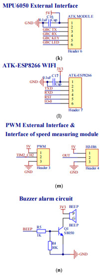 Circuit schematic: (a) chip; (b) reset circuit; (c) start-up model; (d) power filter circuit; (e) crystal resonance circuit; (f) voltage conversion circuit; (g) current foldback circuit; (h) power supply; (i) SWD external interface; (j) USB external interface; (k) MPU6050 external interface; (l) ATK-ESP8266 WIFI; (m) PWM external interface and interface of speed measuring module; (n) buzzer alarm circuit.