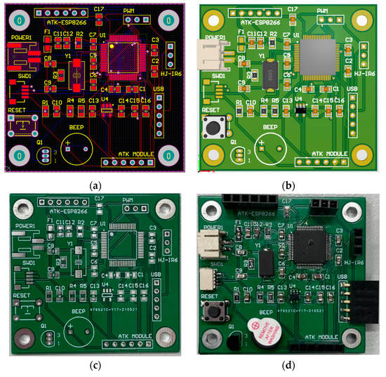 Preview and physical view of the control board: (a) preview of the layout wiring; (b) preview of the PCB; (c) physical view of the control board before welding; (d) physical view of the control board after welding.