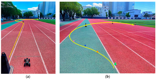 The test car was set to gradually accelerate from a standstill to 13 m/s (47 km/h) by means of a PWM program. The trolley turned and drove according to the prescribed trajectory. The test site layout is shown in Figure 7.