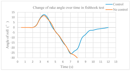 Change of rake angle over time in fishhook test.