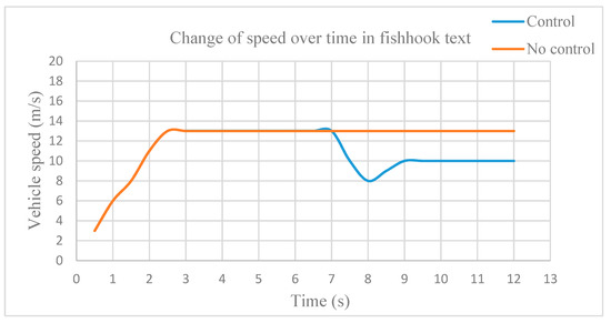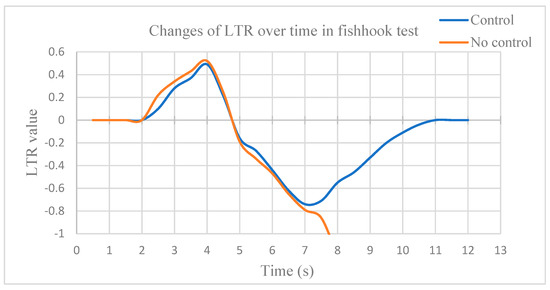 The control system is not triggered in 2–7 s, and the vehicle speed remains the same, with and without control in the same conditions. The curve of this process is not completely consistent because the actual test site is in an outdoor environment. The test car is inevitably affected by wind speed, ground flatness, unstable fluctuations within the sensor’s tiny error range, and other uncontrollable minor external factors. Therefore, the actual roll angle and the LTR change are different due to interference, but the changing trend in the overall curve is the same, which has no influence on the analysis of the test results.