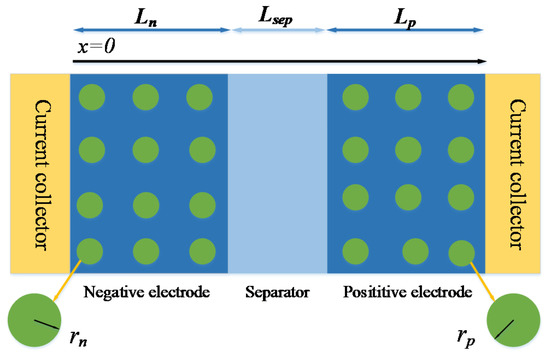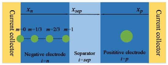 As shown in Figure 2, four characteristic points were selected in the x axis negative electrode thickness direction, and based on these four characteristic points, the heterogeneous of electrochemical reaction in the negative electrode was reflected. The positive electrode was directly modeled by a single-particle model. In order to distinguish the characteristic points of the different electrodes, subscripts i and m were used to represent the positions of the electrodes and characteristic particles on xi, respectively. i = n is negative, i = p is positive and i = sep is separator. m is 0, 1/3, 2/3 and 1, respectively [8]. Next, taking the solution of negative electrode parameters in the model as an example, the order of P2D model will be gradually reduced.