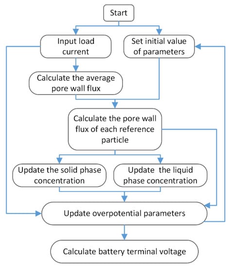 The battery experiment was carried out on a Neware battery test system at 25 °C. The experimental sample was a button-shaped LiCoO2 battery (40 mAh). The negative electrode material of the battery was graphite. All the simulation experiments in this paper were programmed on MATLAB. The calculation flowchart of the SMP model is shown in Figure 3. The simulation parameters of the model are given in Table 3.