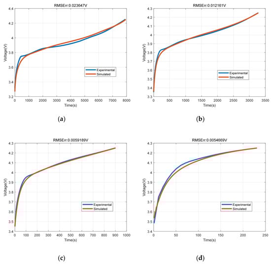 The SMP model was simulated with 0.5C, 1C, 2C and 3C current rates. The terminal voltage fitting results under the four charging currents are shown in Figure 4. It can be seen from the simulation results that the simulation results of SMP model can fit the experimental results well compared with the experimental values under four current conditions. The root mean square error (RMSE) was within 23.9 mV.