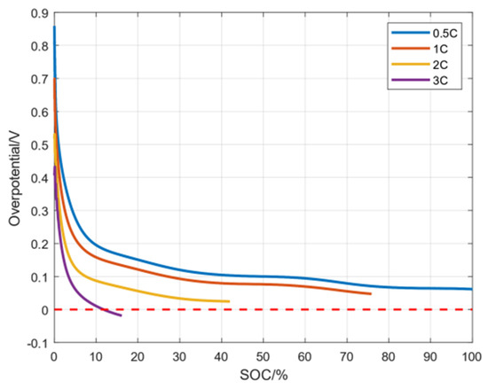 When , a negative electrode lithium precipitation side reaction does not occur. Only when does the negative electrode lithium precipitation side reaction occurs. Through simulation experiments, the average overpotential of the negative electrode lithium precipitation side reaction under three magnifications is shown in Figure 4. It can be seen from the figure that is a gradually decreasing function and eventually tends to 0 V. Moreover, the greater the charging current rate, the more easily the overpotential reaches a value below 0 V. In order to avoid a side reaction of lithium precipitation in the negative electrode, needs to be controlled above 0 V, and is expected to be as large as possible without causing damage to the battery.