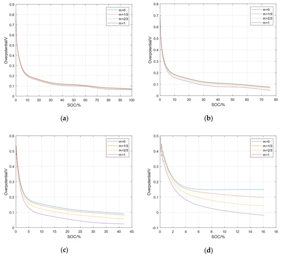 The heterogeneous side reaction overpotentials in the negative electrode. (a) Overpotential at 0.5C; (b) Overpotential at 1C; (c) Overpotential at 2C; (d) Overpotential at 3C.