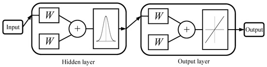 There are many kinds of implementation speed prediction methods, and they are mainly based on the exponential function, the Markov chain, and neural network. In addition, Y. Zhang developed a comprehensive speed profile prediction method, which combined the macro and micro speed prediction based on the Precise-Spike-Driven (PSD) method with the linear regression MC, estimated the parameters in the linear regression through polynomial features (PF), and synthesized the final predicted speed profile [19]. By using vehicle to vehicle (V2V) communication technology, F. Zhang realized accurate prediction of future speed [20]. Speed prediction methods based on the exponential function or Markov chain are able to fit the future trend of the speed, but with the increase of predict period, accuracy decreased more obviously, and its adaptability to condition changes is poor [21]. However, the speed prediction method based on neural network can accurately predict the future speed sequence by using the learning fitting characteristics of artificial neural network and sample condition training, and the implementation method is relatively simple. Therefore, RBF-NN is adopted in this paper to predict the future speed, and its topological structure is shown in Figure 2.