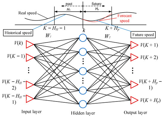 The neural network model consists of input layer, hidden layer and output layer, but RBF-NN model has only one hidden layer. The input layer of RBF-NN is composed of the input sequence of the model. The number of neurons in the hidden layer is determined according to the needs of the problem. The input sequence is transformed by nonlinear mapping, and then the output corresponding to the input signal is obtained by the linear mapping transformation of the output layer. RBF-NN uses the neurons in the hidden layer to cover all the sample patterns by clustering, and then obtains the minimum mapping error by modifying the weight of the output layer, which greatly improves the learning speed of the network and can be used for real-time predictive control. Vehicle speed prediction is a typical nonlinear time series prediction problem. RBF-NN has obvious advantages in solving this kind of prediction problem. Due to the learning and fitting characteristics of neural network. This study only takes vehicle speed as the input and output of the vehicle speed prediction model. The schematic diagram of vehicle speed prediction is shown in Figure 3.