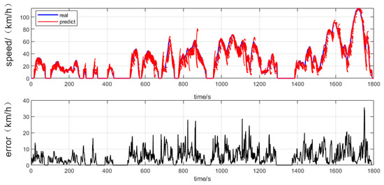 Then, the error of each prediction and the overall root mean square error are taken as the evaluation index, and the corresponding optimal input speed duration and spread parameters are solved according to different prediction duration. Figure 4 shows the prediction effect chart under China light-duty vehicle test cycle (CLTC) condition. The error and root mean square error of each prediction are calculated according to Equation (3).