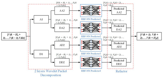 WPT has the characteristics of decomposition and reconstruction. After the decomposition of the wavelet packet, the driving conditions have more detailed information. When using the RBF-NN for training and prediction, the fluctuation and trend of the speed can be analyzed more comprehensively. In this paper, the WPT is combined with the vehicle speed predictor based on RBF-NN. Firstly, the two-scale decomposition of the input vehicle speed sequence is divided into an approximate coefficient and three detail coefficients by the wavelet packet decomposition principle. Then, four RBF-NN predictors are used to take the four coefficient sequences as the input of the predictor to get the corresponding four groups of prediction coefficient sequences. Then, the wavelet packet reconstruction is used to get the corresponding predicted speed sequence, and the speed prediction model of RBF-NN based on WPT is established, as shown in Figure 5.