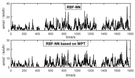 As can be seen from the figure, the speed predicted by the model based on RBF-NN can keep consistent with the change trend of the real speed every time, and can achieve good prediction accuracy. However, it is found that with the increase of the predicted time length, the deviation between the predicted speed and the actual speed also increases, and the resulting prediction error also becomes larger. Moreover, the variation trend of the prediction error under the same working condition is similar, and the acceleration mutation exists in the places with large errors. Therefore, if the speed information can be analyzed more perfectly, the prediction effect of RBF-NN speed prediction model in the long time domain can be further improved.